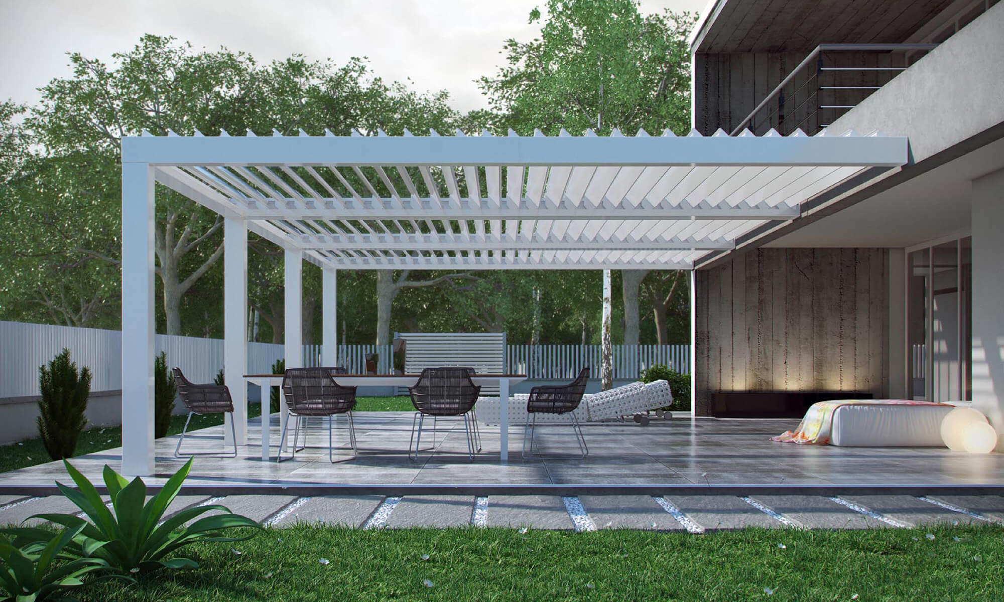 Hliníkové lamely je možné naklopiť od 0 do 130 ° tak, aby odrážali slnko počas celého dňa – strechu pergoly dokonca môžete rozdeliť na niekoľko nezávislých sekcií a naklápať lamely v každej sekcii zvlášť. Svetlo aj tieň tak bude presne tam, kde ich chcete mať.