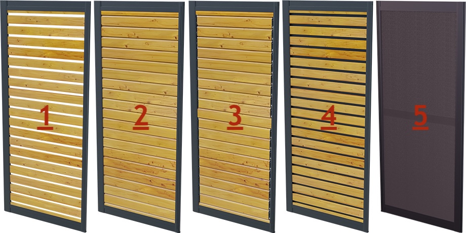 Jednotlivé hliníkové prvky posuvných stien je možné farebne zladiť s pergolou alebo carportom ARTOSI, pretože ponuka štandardných farieb je totožná. Pre lakovanie je možné zvoliť akúkoľvek farbu RAL, pre panely taktiež možnosť technológie Decoral.